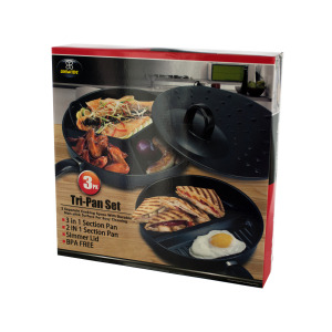 Perfect for cooking a variety of foods in the same pan, this Tri-Pan Section Pan Set features separate cooking spaces with durable gold Teflon non-stick surfaces for easy cleaning. Set includes one 12" 3 in 1 section pan, one 10" 2 in 1 section pan and a simmer lid. BPA free. Comes packaged in an individual box.