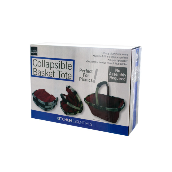 Perfect for picnics, shopping and more, this handy Collapsible Basket Tote features a sturdy aluminum frame and a nylon liner with inside zip pocket and a detachable interior hook and loop pocket. Easy to fold and store anywhere. No assembly required. Measures approximately 14" x 12.75" x 9". Colors may vary. Comes packaged in an individual box.