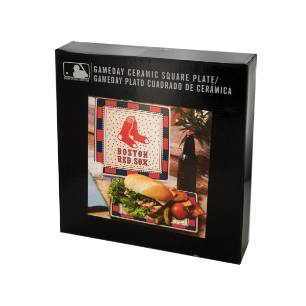 Great for gameday, this MLB Licensed Boston Red Sox Ceramic Square Plate features a white ceramic plate with blue and red decorative designs and the Red Sox logo in the center. Measures approximately 10.25" x 10.25". Microwave and dishwasher safe. Comes packaged in an individual box.