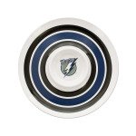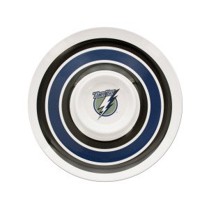 Perfect for parties and everyday use, this NHL Licensed Tampa Bay Lighting Chip & Dip features a round white plastic dish with black and blue stripes and a 5.5" center dip section with the Lightning logo. Measures approximately 14" in diameter. Dishwasher safe. Comes loose.