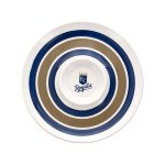 Perfect for parties and everyday use, this MLB Licensed Kansas City Royals Chip & Dip features a round white plastic dish with blue and brown stripes and a 5.5" center dip section with the Royals logo. Measures approximately 14" in diameter. Dishwasher safe. Comes loose.
