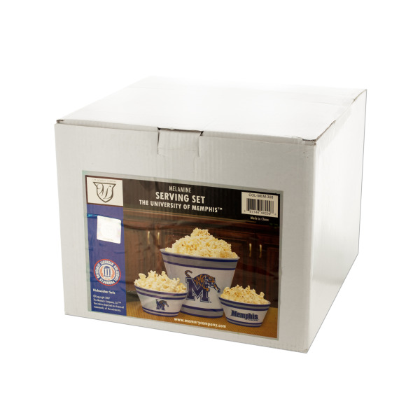Show off your team pride with this fun 3-piece Collegiate Licensed University of Memphis Melamine Serving Set featuring a large bucket container and two smaller bowls all adorned with the Memphis Tigers logo and blue and grey stripes. Great for serving popcorn, snacks and more. Dishwasher safe. Comes packaged in an individual box.