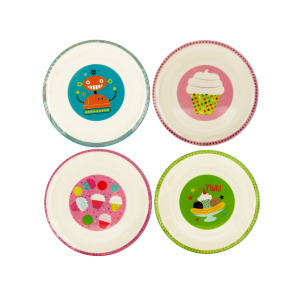 Perfect for desserts, snacks and small meals, this fun 2-piece Printed Plastic Plates Set features durable plastic plates with colorful prints and polka dot borders. Comes in assorted styles that may include cupcakes, banana split or robot. Each plate measures approximately 8" in diameter. Comes shrink wrapped.