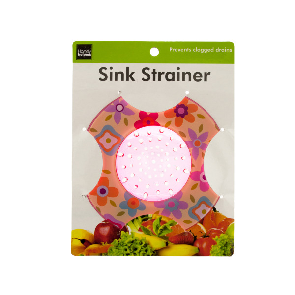 Elevate kitchen aesthetics with the Decorative Sink Strainer collection, featuring various stylish designs. Options include pink with flowers, green with sunflowers, purple with flowers, green with apples, blue with blue designs, and gray-black with white floral swirls. Each strainer measures approximately 5.25" in diameter, equipped with a 2.625" diameter strainer to efficiently capture debris and prevent sink clogs. These strainers combine aesthetic appeal with practical functionality, fitting most standard sinks for effortless installation and maintenance. Comes packaged in a hanging panel. The Package measures approximately 5.75" x 7.75".,Decorative Sink Strainer,