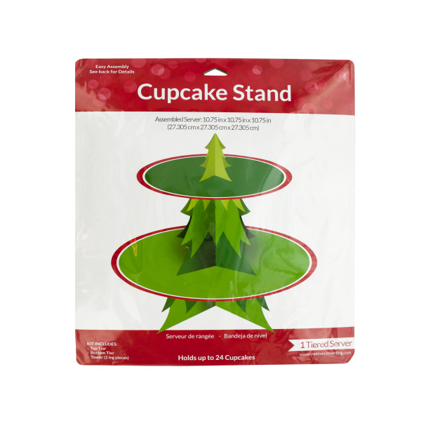 Perfect for holiday parties and more, this charming Tree-Shaped Tiered Server features a green two-tiered server made of chipboard with an evergreen tree design. Holds up to 24 cupcakes. Assembled server measures approximately 10.75" x 10.75" x 10.75". Easy assembly instructions included. Comes packaged in a hanging poly bag.