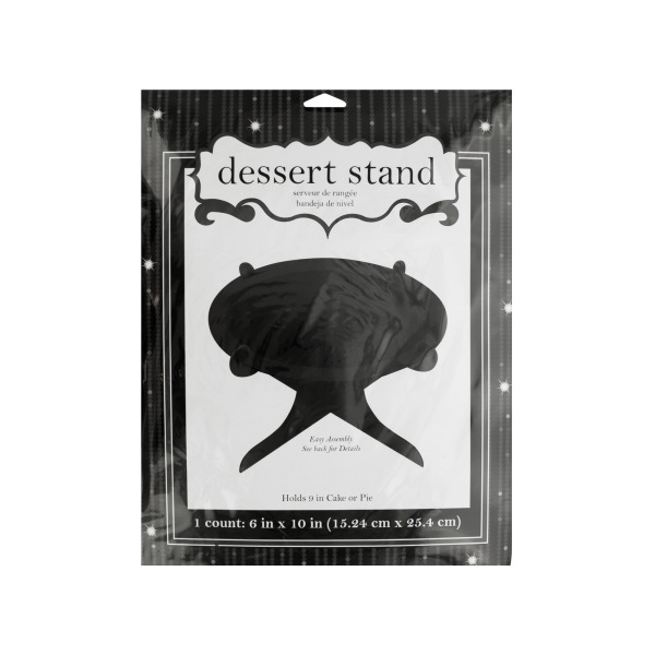 Showcase your sweets with this attractive Black Glitz Dessert Stand featuring a round black stand with a glitter trim. Holds 9" cake or pie. Measures approximately 6" x 10". Easy assembly instructions included. Comes packaged in a poly bag with a header card.