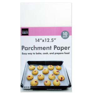 Easily bake pastries, cookies and more with this all-purpose 10-piece Parchment Paper Pack featuring paper baking sheets that leave no mess to clean up. Sheets measure approximately 14" x 12.5". Comes packaged in a hanging poly bag.,Parchment Paper Pack,