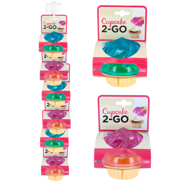Hold a cupcake with frosting on the go with this fun Cupcake 2-GO Portable Cupcake Holder featuring a durable plastic cupcake-shaped holder with a locking transparent top that keeps cupcakes and frosting in place for mess-free transporting. Top rack dishwasher safe. BPA free. Comes in assorted colors. Clip strip comes with 6 pieces.