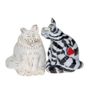 Add sweet fun to the table with these Rachel & Sidney Salt & Pepper Shakers featuring glazed ceramic cats with painted accents and a heart accent. Shakers have stoppers on bottoms. Shakers measure approximately 2.5" x 3.5" and 2.75" x 3.5". Comes packaged in an individual box.