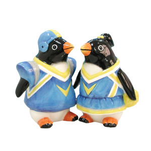Add playful fun to the table with these Game Day Salt & Pepper Shakers featuring glazed ceramic penguins in hockey uniforms. Shakers have magnets to keep them together and stoppers on bottoms. Shakers measure approximately 3.5" x 2.75". Dishwasher safe. Comes packaged in an individual box. Box measures approximately 4.75" x 4.125" x 5.25".