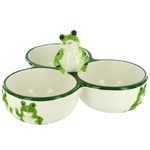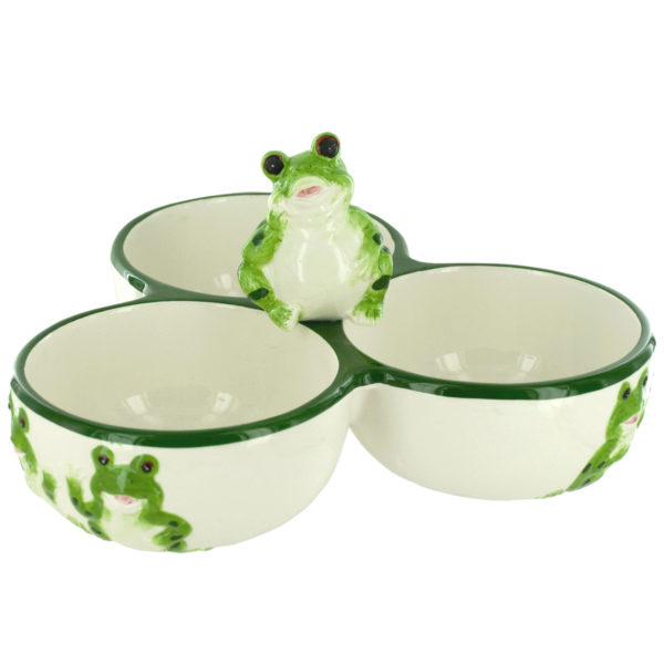 Perfect for servings salsa and dips, this Frog Ceramic Salsa Bowl Trio features three connected ceramic bowls with raised hand-painted frogs, an sitting frog in the middle and dark green accents along the rims. Measures approximately 10.125" x 5.25" x 10.125". Comes packaged in an individual box. Box measures approximately 11" x 6" x 11".