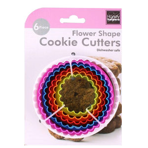Bake delicious and fun-shaped cookies with these adorable flower/ruffled-style cookie cutters! The round cutters are perfect for cutting cookies ranging from small to large sizes. The colors, in order from the smallest to largest, are as follows: orange, red, pink, green, blue, white. There are six total cutters measuring from 1.77" to 3.74" in diameter. The cookie cutters come attached to a hanging tie card. ,6 Pack Flower Ruffle Cookie Cutters,