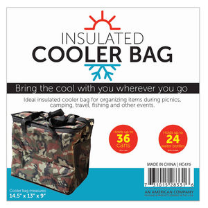 Enjoy icy cold beverages or piping hot refreshments on the go with this sturdy, foldable and reusable thermal Insulated Cooler Bag disguised in Camouflage print. You can keep your food and drinks hot or cold for hours with no ice or heating packs. Included handles and shoulder strap makes this cooler bag ideal for the beach or any outdoor events. Measures approximately 12" tall with lid. Comes packaged in an individual box. Box measures approximately 14.5" x 13" x 9", holding up to 36 cans or 24 water bottles.,Camouflage Folding Insulated Cooler With Travel Strap,