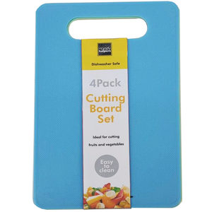 This Value Pack Cutting Board Set is all you'll need to cut a variety of vegetables, fruits, meats, seafood, herbs, and more! Set includes four different colored cutting boards - grey, pastel yellow, mint green, and baby blue. The variety of cutting boards lets you color code them to avoid crossover contamination from poultry and pork. Cutting boards measure 7.5" x 11.5". This colorful pack comes packaged together with a wrap label.,4 Pack Cutting Board Set,