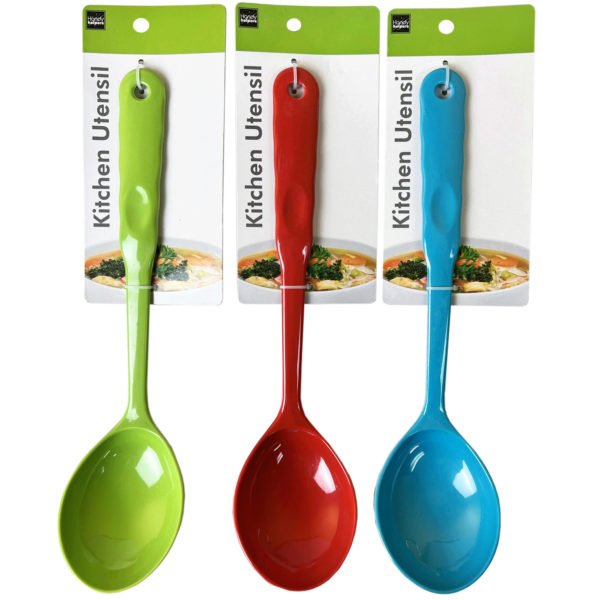 Take your kitchen from boring to fabulous with this Assorted Color Melamine Serving Spoon. Perfect for any kitchen from home to starter apartment. A must-have for every kitchen. Use to serve up your favorite macaroni salad, dessert, and more! The brightly colored assortment includes teal, lime green, and red. The serving spoon comes packaged on a hanging tie card. ,Assorted Color Melamine Serving Spoon,