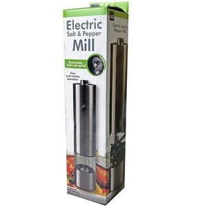 The Stainless Steel Battery-Operated Salt and Pepper Grinder has a mini LED light that illuminates your plate while grinding your favorite spices. Always have fresh cracked pepper, pink Himalayan salt, and more with this easy push-button operation! The durable carbon-steel grinding mechanism pulverizes spices. The grinder is made with stainless steel for durability and has an acrylic window so you can clearly check your spices levels. Measures 9" x 2.3". Requires 4 AA batteries - not included. Comes packaged inside a hanging box. ,Stainless Steel Battery-Operated Salt and Pepper Grinder,