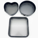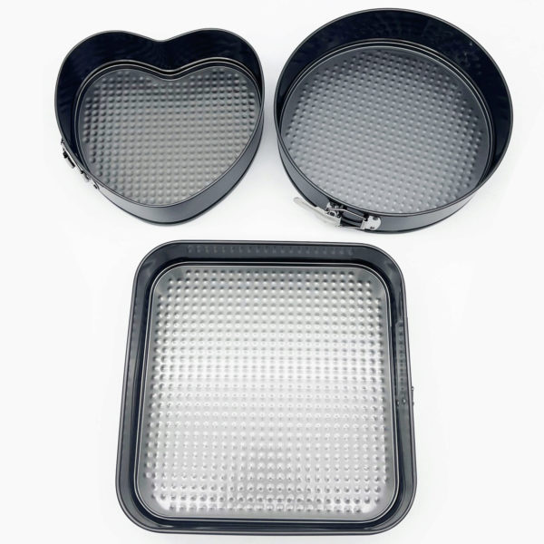 This 3-Pack Cake Pans Baking Set is all you need to become a master baker of your kitchen! This must-have set includes 1 square pan, 1 round pan, and 1 heart-shaped pan with an easy open cake release. The bottom of the pans has ridges to help release your baked items without sticking. This all-in-one baking essential is the perfect way to add to your cookware collection.,3 Pack Shaped Cake Pans Baking Set,