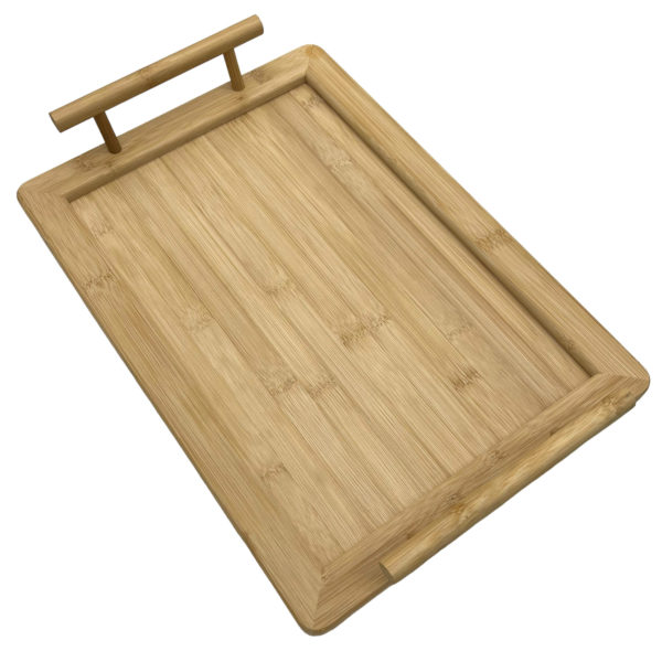 The Bamboo Serving Board Tray with Handles is an attractive and stylish way to serve while entertaining guests. The tray is made of durable bamboo, has a raised edge to keep snacks on the tray, and has two convenient handles to carry and serve. Perfect for serving meals in bed, creating a portable charcuterie board, or serving drinks to guests. This party essential measures approximately 15.5" x .65" x 10.75" with 2" tall handles. Perfect for serving various cheeses, meats, fruits, snacks, desserts, and drinks! Comes packaged loose with a color wrap label.,Bamboo Serving Board Tray with Handles,