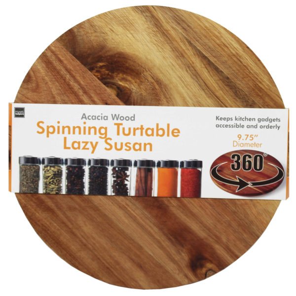 Crafted from acacia wood, this spinning turntable offers both functionality and elegance, making it an essential piece for any home. Measuring 9.75" in diameter, this turntable provides ample space for condiments, spices, sauces, and more, allowing you to keep all your essentials within easy reach. The smooth-spinning mechanism allows for effortless rotation, making it simple to access items from any angle without the need for constant reaching or stretching. this turntable is built to withstand the rigors of daily use while adding a touch of natural beauty to your space. The rich, warm tones of the wood complement any decor style, from rustic farmhouse to modern chic, adding a touch of sophistication to your kitchen or dining area.,9.75" Acacia Wood Spinning Turntable,