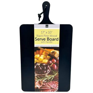 Elevate your serving game and delight your guests with the Chop and Serve Snack Board with Handle. This versatile and stylish board is more than just a serving platter; it's a culinary canvas for presenting your favorite snacks, cheeses, fruits, and more in a way that exudes elegance and charm. The versatile rectangular shape and spacious surface provide ample room for arranging an array of snacks, appetizers, or charcuterie with flair. Whether you're hosting a dinner party, picnic, or a casual get-together, this snack board adds a touch of sophistication to your entertaining. Measures 17" x 10". Comes packaged loose with a color wrap label.,17" x 10" Black Pine Wood Serve Board with Handle,