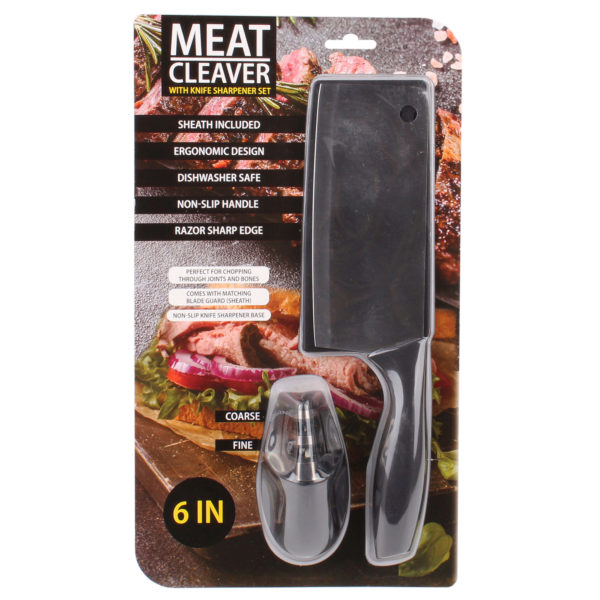 The 6" Meat Cleaver is designed to effortlessly tackle all your meat-cutting needs. Whether you're slicing through thick cuts of beef, pork, or poultry, this cleaver's sharp stainless steel blade ensures clean, efficient cuts with every use. The ergonomic handle provides a comfortable grip, giving you optimal control and reducing hand fatigue during extended kitchen sessions. The included mini sharpener is compact and convenient, allowing you to maintain the sharpness of all your knives with ease. This kitchen prep essential comes packaged on a hanging blister card. ,6" Meat Cleaver with Mini Knife Sharpener,