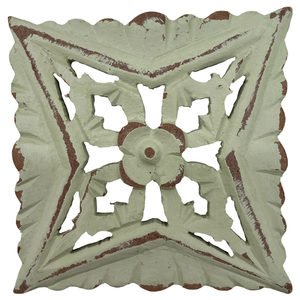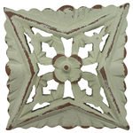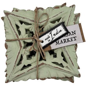 Here's a unique design of 4 Piece Sage Wood Coasters. The square design has a four pointed star with cutouts. Distressed for aging adds earth tone colors. Cutouts make a beautiful open pattern. Each has bottom corner feet. The set of 4 coasters come twine wrapped with a hang tag.,4 Piece Sage Wood Coaster Set,