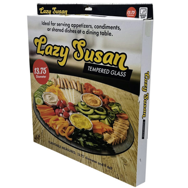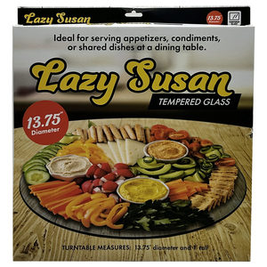 This Lazy Susan boasts a smooth and durable surface that's perfect for serving appetizers, condiments, desserts, and more. The transparent design allows the beauty of dishes to shine through, adding a touch of sophistication to any table setting. Measuring 13.75 inches in diameter and 1/2 cm thick, this Lazy Susan provides ample space for serving a variety of items, making it ideal for family dinners, dinner parties, buffets, and gatherings of all sizes. The smooth rotating mechanism allows for easy access to all sides of the table, ensuring that everyone can reach their desired dishes with ease. Whether hosting a formal dinner party or a casual gathering with friends, this Lazy Susan is sure to impress guests and make serving a breeze. Plus, its compact size and lightweight design make it easy to store when not in use, so you can enjoy the convenience of a Lazy Susan without taking up valuable space in your kitchen. Comes packaged inside a hanging-colored box. Package measures 14” x 1.25” x 15.25”.,13.75" Smooth Rotating Glass Serving Turntable,