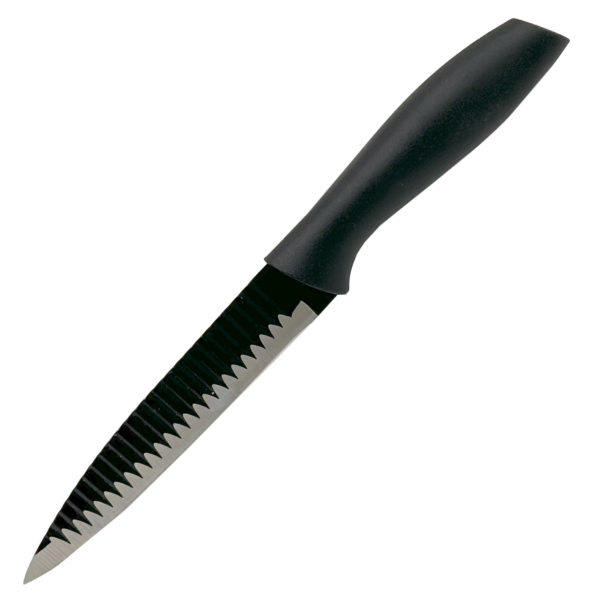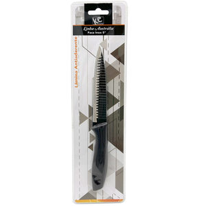 Upgrade kitchen tools with the 5" Stainless Steel Blade Vegetable Knife, designed for precision and style. This knife features a high-quality stainless steel blade with a unique embossed black and stainless steel look, offering both functionality and a sleek design. The blade includes non-stick properties and top waves, ensuring smooth slicing and easy food release. Paired with an ergonomic PP handle, this knife provides a comfortable grip for effortless cutting and chopping. Ideal for preparing vegetables and fruits, this versatile kitchen essential combines modern aesthetics with superior performance, making it a must-have for any culinary enthusiast. Comes packaged inside a hanging clamshell package. The clamshell package measures approximately 3.5" x 12.5".,5" Stainless Steel Vegetable Knife,