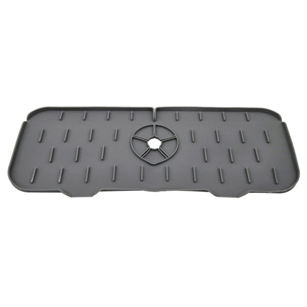 Designed to keep the sink area clean and organized, this silicone splash guard fits snugly around taps to provide a space for storing and drying sink essentials. It drains excess water directly into the sink, preventing moisture buildup on countertops. Made from durable and easy-to-clean silicone, this mat offers a practical solution for maintaining a tidy kitchen or bathroom sink area. The splash guard measures 14.56" x .31" x 5.62" and comes packaged in a hanging card. The approximate measurements with packaging are 5.75" x 9".,Silicone Kitchen Sink Splash Guard,