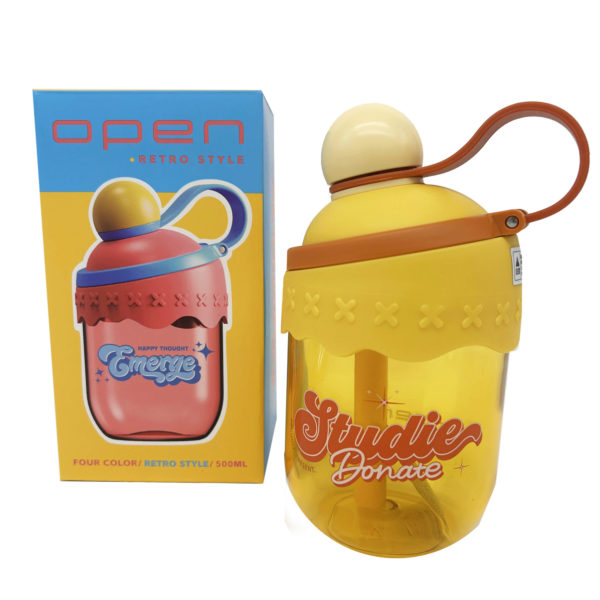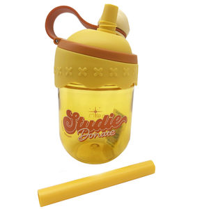 Introducing the 17 oz Round Twist Cap Portable Water Bottle, specially designed for kids who love to stay active and hydrated! Available in fun colors like yellow, blue, green, and pink, this BPA-free water bottle is perfect for little hands. It features a twist cap with a sippy straw, a comfy handle for easy carrying, and a sealing ring to keep it completely leakproof — no spills, just sips! With the cheerful message "Be Happy, Discover Energy Boost" on the bottle, it adds a splash of positivity to every drink. The bottle measures 3.25" x 7", making it just the right size for kids to take to school, sports, or outdoor play. Packaged in a colorful box with a marked color indicator for easy identification, the box measures approximately 3.75" x 3.75" x 7".,17 oz Round Twist Cap Water Bottle in Assorted Colors,
