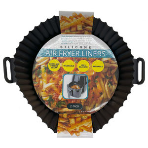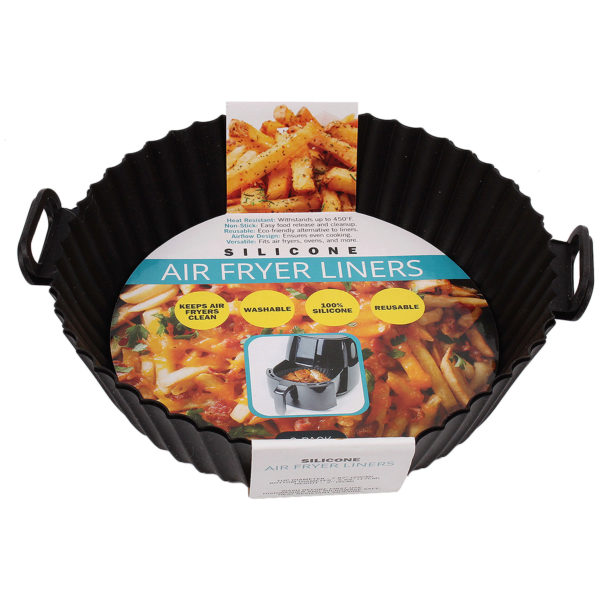 This 2-pack of round heat-resistant silicone liners enhances air frying convenience and keeps appliances clean. Made from 100% high-quality silicone, each liner withstands temperatures up to 446°F and features a non-stick surface for hassle-free cooking and cleaning. Reusable and washable, these liners provide an eco-friendly alternative to disposable options. The added convenience of two built-in handles ensures easy access and safe handling, making removing food from the air fryer effortless. Perfect for maintaining a spotless air fryer, these liners offer a practical solution for mess-free and efficient cooking. Ideal for: Frying, roasting, and baking. Each liner measures 6.5" in Diameter x 2" in depth. Comes packaged in a hanging sleeve card. ,2 Pack Round Heat Resistant Air Fryer Silicone Liners,
