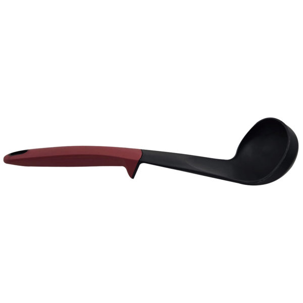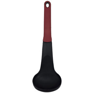 The 11.25" Cooking and Serving Ladle is a versatile kitchen essential, designed with a mini built-in stand that keeps it raised on countertops, stoves, pots, or pans, preventing mess and keeping surfaces clean. With heat resistance up to 400 Fahrenheit degrees, this durable ladle is perfect for serving soups, stews, sauces, and more, making it ideal for everyday cooking and entertaining. Comes in assorted colors, red and gray, and is packaged with a hang tag.,11.25" Cooking and Serving Ladle,