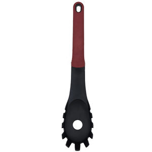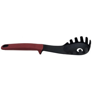 The Spaghetti Strainer & Server Spoon Pasta Fork is a versatile tool designed for efficient pasta preparation, featuring a built-in mini stand that keeps it elevated on countertops, stoves, pots, or pans for a cleaner cooking area. With heat resistance up to 400 Fahrenheit degrees, this durable pasta fork is ideal for straining, serving, and portioning various types of pasta, including spaghetti, fettuccine, and linguine. It also includes a hanging hole for easy storage and accessibility, allowing it to be conveniently put away or held within reach. Available in assorted colors, red and gray, and packaged with a hang tag.,Spaghetti Strainer & Server Spoon Pasta Fork,