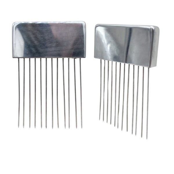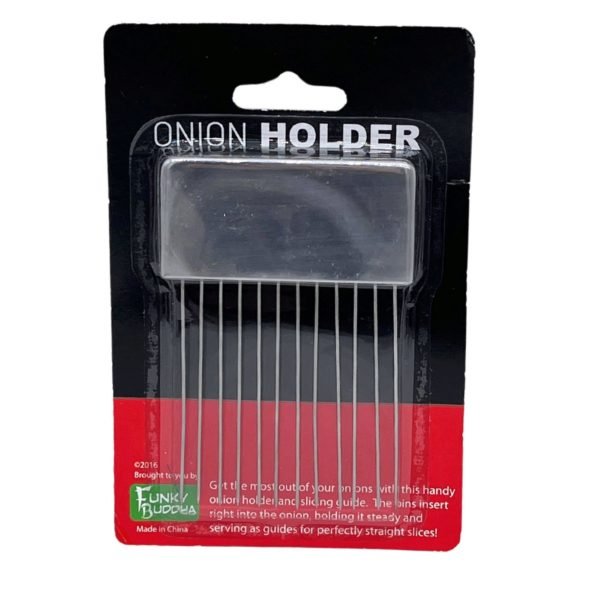 The Funky Buddha Stainless Steel Onion Holder is a must-have kitchen tool for achieving perfectly even slices with ease. Featuring a durable stainless steel handle and sharp, evenly spaced prongs, this holder securely grips onions, tomatoes, potatoes, and other vegetables while protecting your fingers from accidental cuts. Its ergonomic design ensures a comfortable grip, making slicing faster, safer, and more efficient. Ideal for both home cooks and professional chefs, this slicing guide helps you achieve precision cuts every time. Packaged in a sleek, hang-tab retail card for convenient display, the Funky Buddha Onion Holder is an essential addition to any kitchen arsenal.,Funky Buddha Stainless Steel Onion Holder,