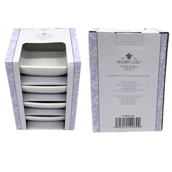 Add elegance to your entertaining essentials with this Set of 4 Squared Ceramic Tapas Bowls from Shabby Chic. These pristine white ceramic dishes are perfect for serving small bites, dips, or sauces, and their clean square shape brings modern charm to any table setting. Packaged beautifully in a floral-accented open-face box with a soft lavender and white color scheme, this set makes a perfect gift or addition to your kitchen. Dishwasher and microwave safe, these bowls are both stylish and practical ideal for everyday use or special occasions.,Set of 4 Squared Ceramic Tapas Bowls in a Box,