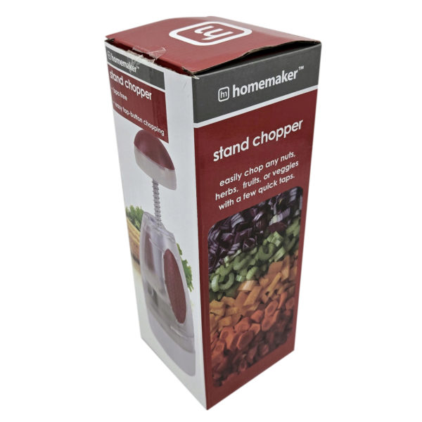 The 10" Food Stand Chopper offers a convenient solution for quick and efficient food preparation. Designed with an easy tap-button operation, this BPA-free chopper measures 3.30" D x 10" H, with packaging dimensions of 3.75" x 3.75" x 10.25". It is ideal for chopping nuts, herbs, vegetables, and more with minimal effort. The compact design allows for easy storage, making it suitable for any kitchen space. Its mess-free functionality ensures clean and precise chopping, reducing prep time. Perfect for various kitchen tasks, this chopper enhances efficiency and convenience in food preparation.,10" Food Stand Chopper,